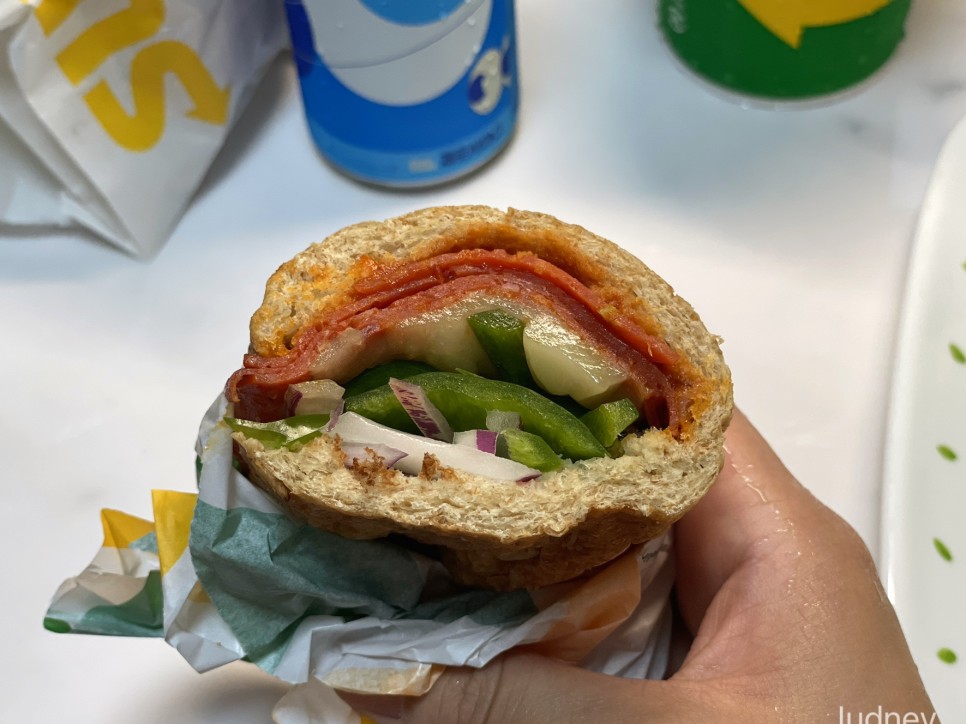 이 피자썹은 서브웨이 직원들 사이에 피자맛 샌드위치라고 불리며 입소문이 난 히든메뉴였다고 해요. 토마토 소스에 페퍼로니 햄들 가득넣고 피망,양파,할라피뇨 등이 올라갑니다. 피자를 샌드위치로 만들었다고 하면 되겠네요.