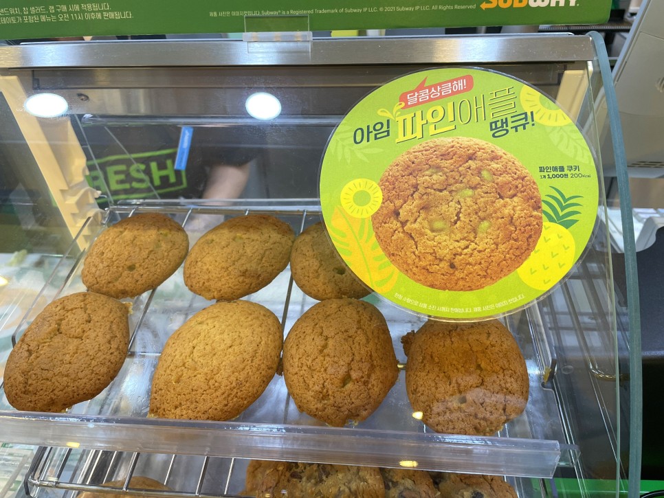 신상품 파인애플 쿠키도 출시됐습니다. 지난달엔 민트초코 쿠키라서 쿨하게 패스했는데요. 여름맞이 육수 좀 흘리면서 서브웨이까지 걸어갔더니 달짝지근한 파인애플쿠키가 너무 맛있어보이는거 있죠. 칼로리가 낮지는 않으니까 1개만 구매해봅니다.