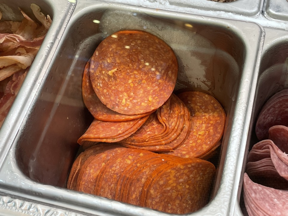 페퍼로니 햄을 빵 가득 올려줍니다. 다른 햄보다 크기가 작은 편이라서 그런지 6장이나 올라오네요. 같은 페퍼로니라도 서브웨이에서 만드는 햄은 더 고급지고 맛있어보이는 느낌이에요.
