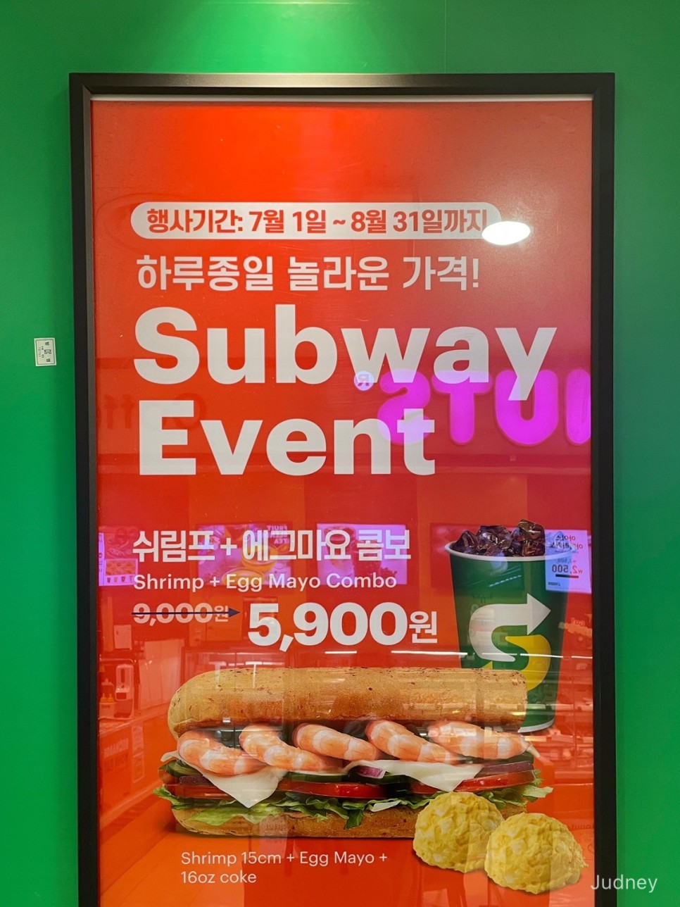 쉬림프 15cm + 에그 마요 + 음료수 1컵 콤보도 7월 행사 중입니다. 9000원 → 5900원으로 무려 3100원이나 할인이 들어갑니다. 이번 7월 행사중에서 할인금액이 가장 큰 품목이네요.